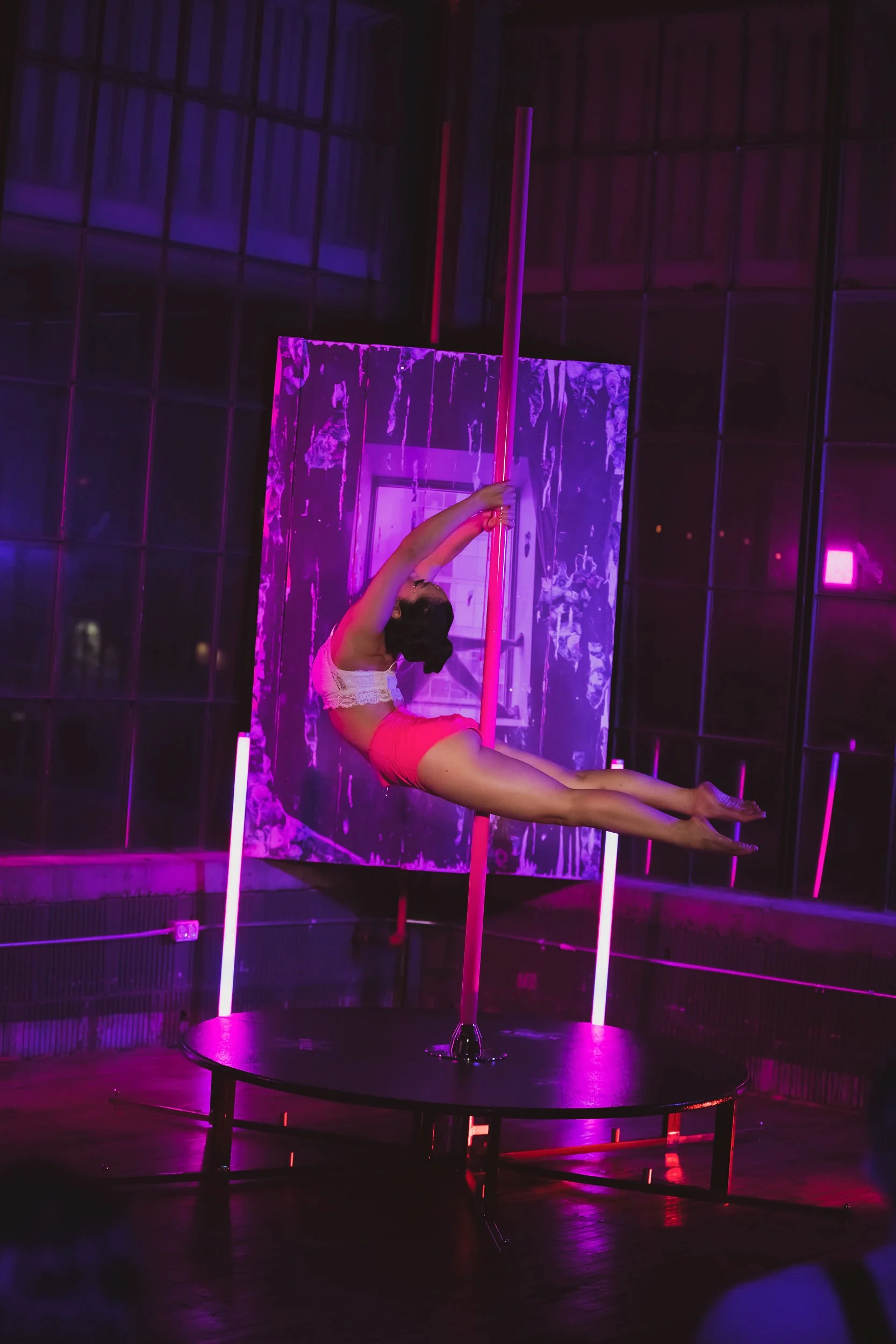 1 pole dancer performing on a standalone stage pole. No rigging required, can be set-up almost anywhere.